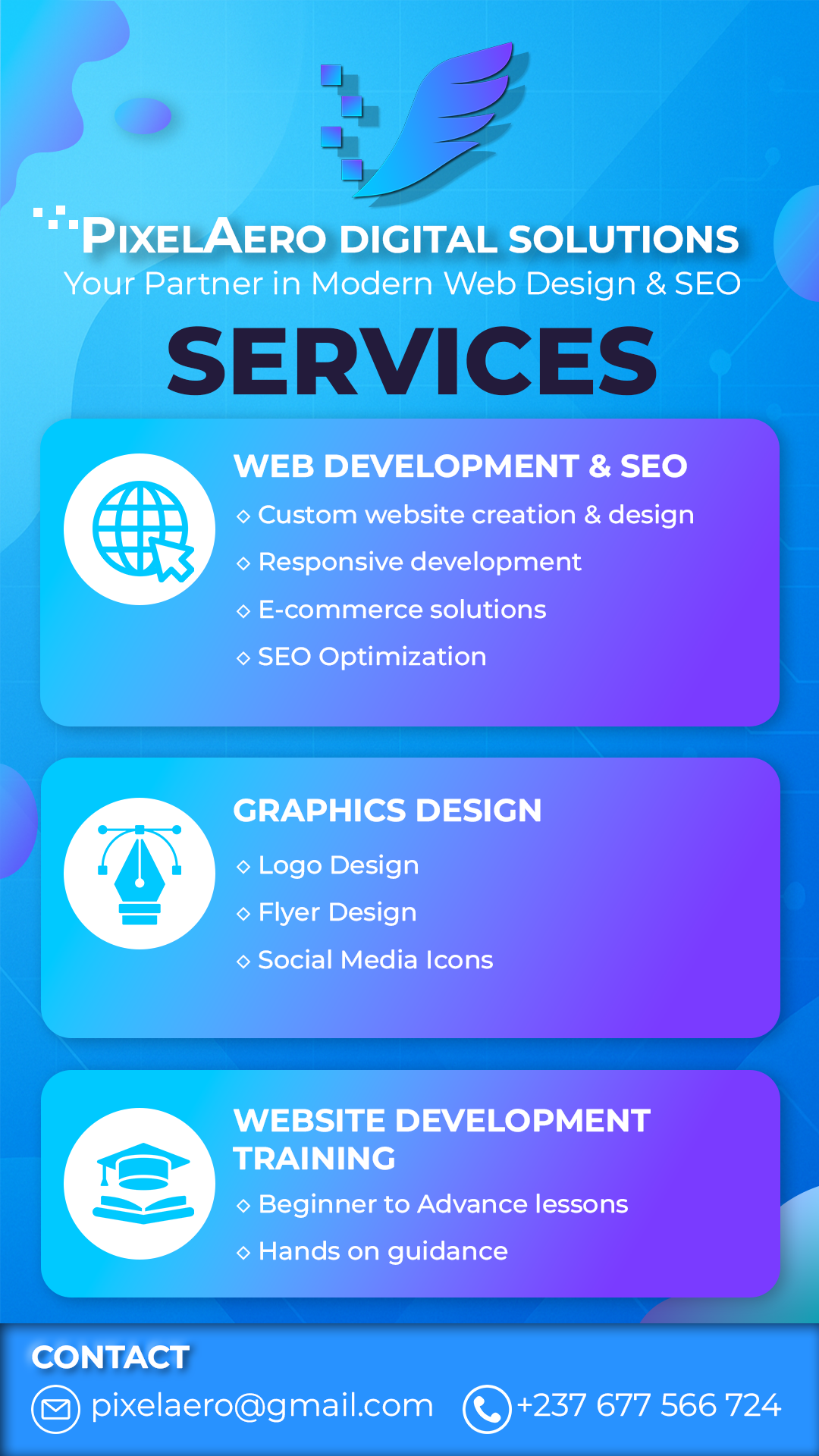 A remastered brand collateral piece showcasing a full suite of digital services. This design highlights a modern, tech-forward aesthetic using vibrant gradients and custom iconography. The layout focuses on clear information architecture, breaking down complex service offerings into digestible sections to help the client effectively communicate their value proposition to prospective leads.
