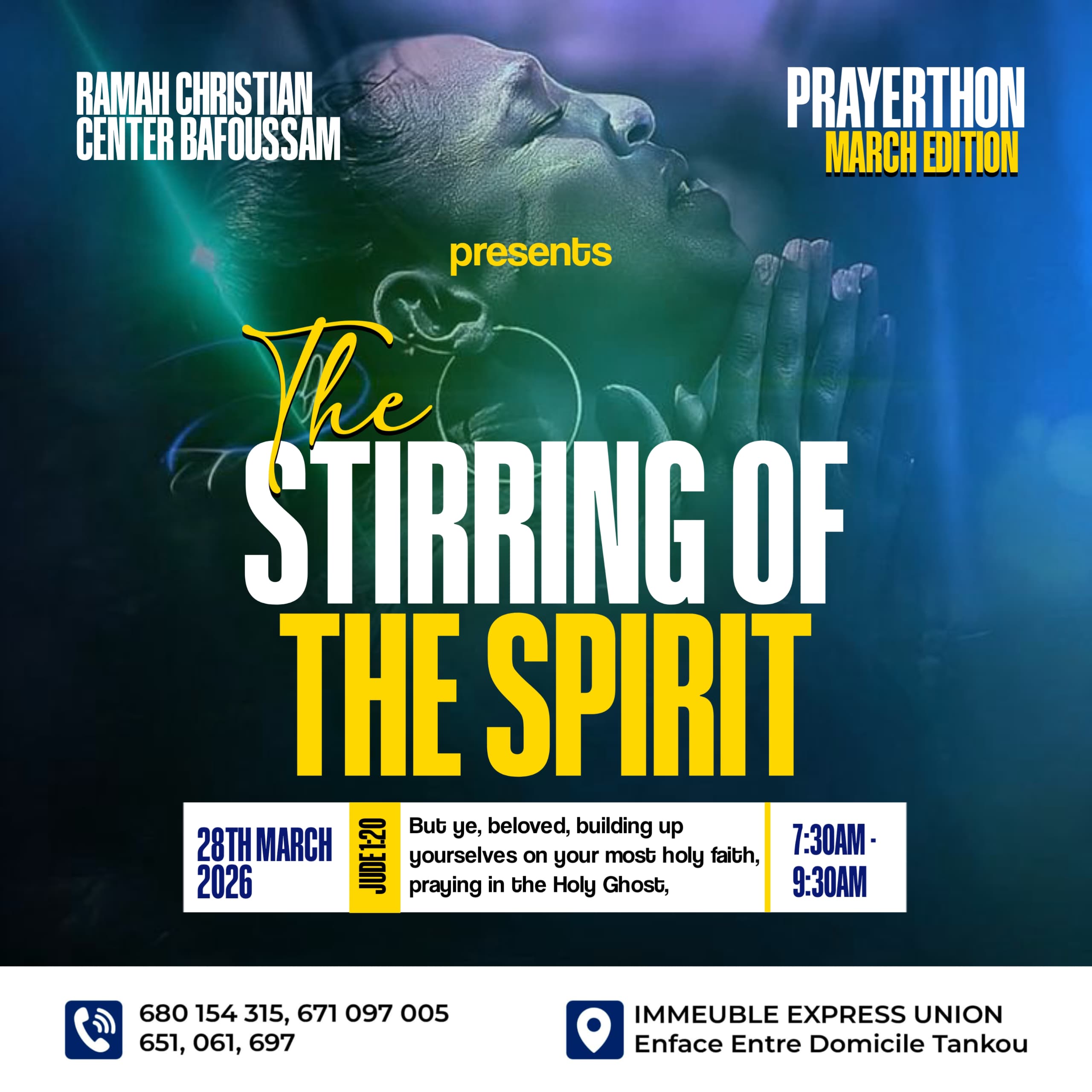 A high-impact visual identity for a large-scale spiritual event in Bafoussam. This design uses advanced photo manipulation and cinematic lighting effects to create an atmospheric, “premium” feel. The typography was strategically layered to maintain readability against a complex background, ensuring all logistical details (time, venue, contact) are immediately accessible for attendees.
